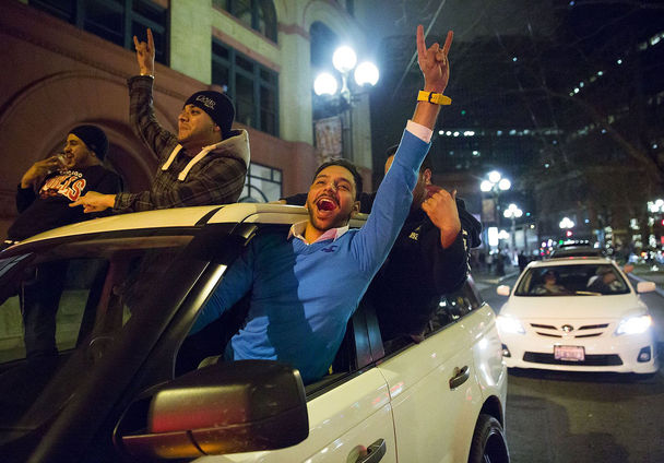 With horns blaring, ecstatic Seattle Seahawks fans celebrate in Pioneer Square after Sunday’s NFC Championship win against the San Francisco 49ers. While the 2006 Super Bowl is a sour memory for Seattle fans, they say this year — and this team — are different.