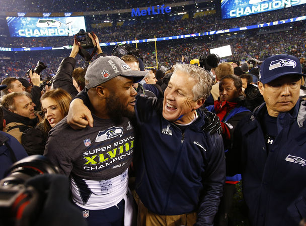 Seahawks fullback Michael Robinson, left, and coach Pete Carroll embrace after the Super Bowl.